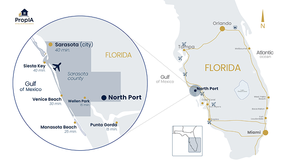 La ubicación de North Port y Sarasota ofrece oportunidades para inversionistas y familias. Este corredor estratégico de crecimiento ha impulsado un desarrollo constante, consolidándose como un punto clave en la Costa Oeste de Florida.
